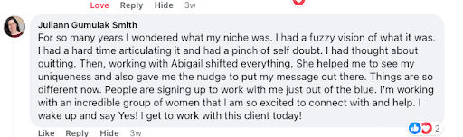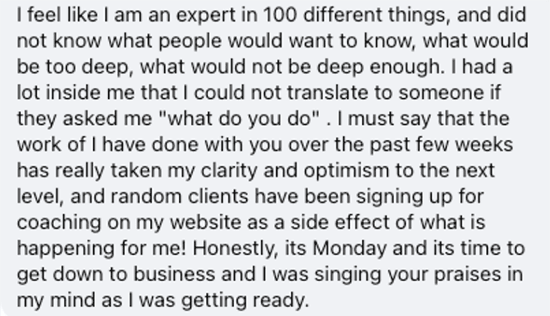 She had zero clients, no message, and was unsure how she’d get clients. We gave her the formula.